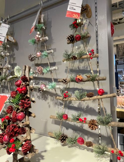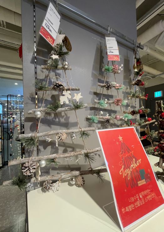 아래 사진 속 첫 번째 트리는 우리가 일반적으로 생각하는 크리스마스트리였는데 보기 싫은 다리를 가려주는 덮개가 분위기를 한층 따뜻하고 화사하게 만들어주는 것 같았어요. 심플하고 예쁜 벽 트리도 있었는데 마침 지금 세일 기간이었어요. 필요하신 분들은 지금 바로 모던하우스로 가서 겟하세요.^^