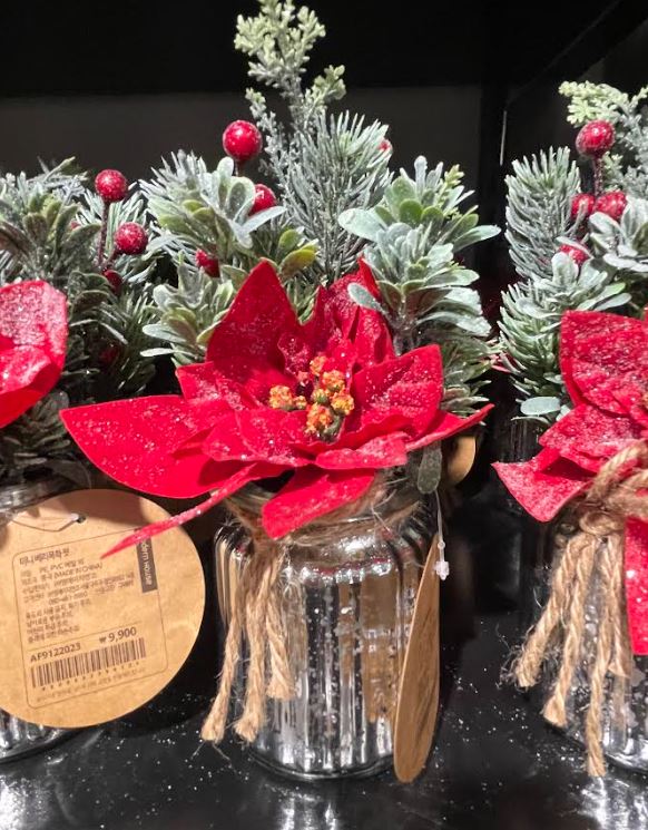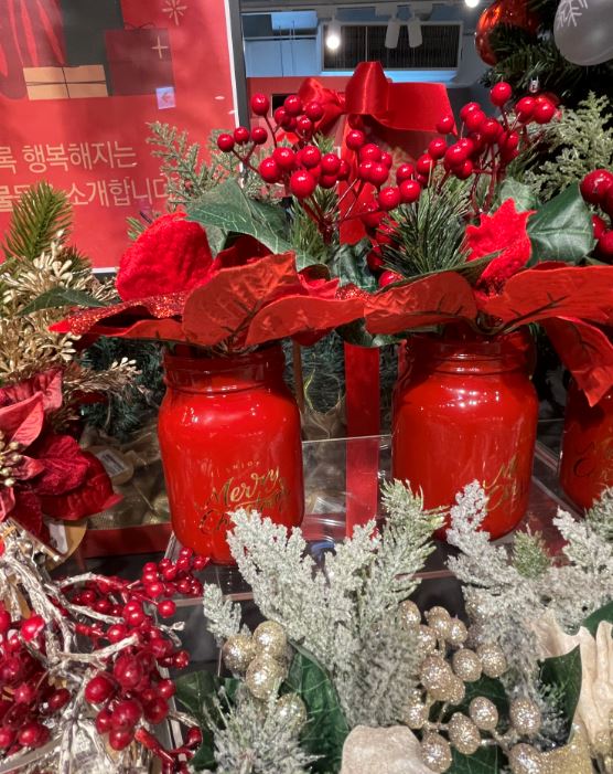 크리스마스 하면 역시 빨간색이 떠오르죠. 포인트로 집안 곳곳에 올려두는 것만으로도 크리스마스가 된 기분을 느낄 수 있습니다. 맨 오른쪽 화병이 가장 마음에 들었는데 위에 뿌려진 하얀색 가루가 떨어지는 것이 조금 아쉬웠어요.